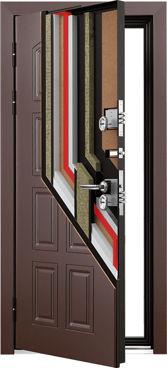 В дверях серии SNEGIR 60 терморазрыв располагается как в коробе, так и в полотне двери. В коробе двери находится изолирующий слой, располагающийся между внешней и внутренней частью короба. В качестве такого слоя выступает MDF 3,2 мм. Терморазрыв в полотне "делит" дверь на внешнюю и внутреннюю половины. Внутренняя часть не выпускает тепло из Вашего дома, а внешняя не позволяет проникать холоду извне.